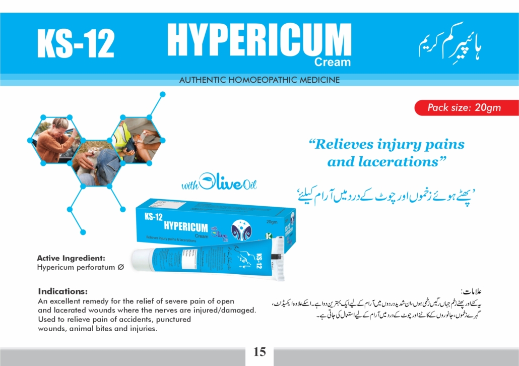You are here: Home1 / Shop2 / Homoeopathic Medicines3 / Combinations4 / KS-12 HYPERICUM Cream (With Olive Oil) ‘’ Relieves injury pains & lac...